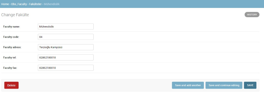 class Faculty(models.Model): faculty_name = models.CharField(max_length=50) faculty_code = models.CharField(max_length=20) faculty_address = models.CharField(max_length=220) faculty_tel = models.CharField(max_length=12) faculty_fax = models.CharField(max_length=12)