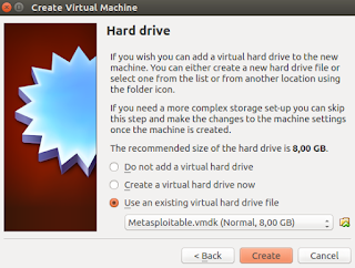 Şimdi ki aşamada ise aşağıdaki fotoğraftaki gibi “Use an existing virtual hard drive file” seçeneğini işaretleyip. Sağ kısımdan Metasploitable’n olduğu dizine gidip Metasploitable.vmdk‘yi seçiyoruz ve Open dedikten sonra Create diyerek kuruluma devam ediyoruz.